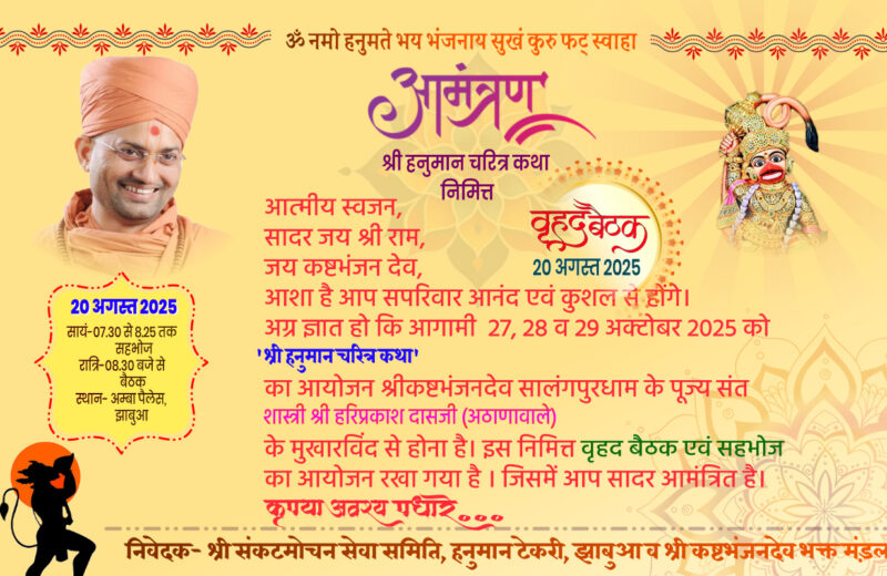आत्मीय स्वजन, यह हम सब के लिये अती प्रसन्नता का विषय है की सालंगपुर धाम श्री कष्टभंजन हनुमान जी महाराज के संत श्री स्वामी हरीप्रकाशदास जी के मुखारविंद से